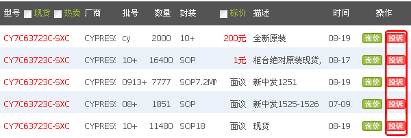 為了更好的規范網站上的現貨和價格信息,使信息更真實、更準確,讓采購者能夠更放心地在網站上詢價和采購,元器件交易網針對現貨、熱賣、優勢庫存特推出e投訴(價格、現貨)服務。
